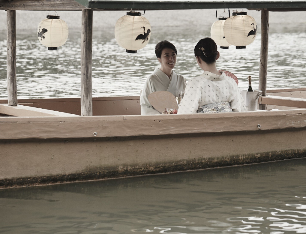 星のや京都時代。夏の風物詩鵜飼の広報写真の撮影のモデルのお手伝い。着物好き 現在のサステナビリティ推進室も