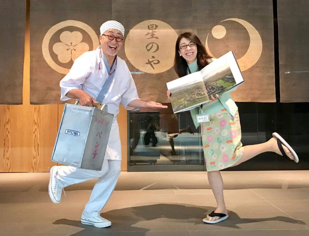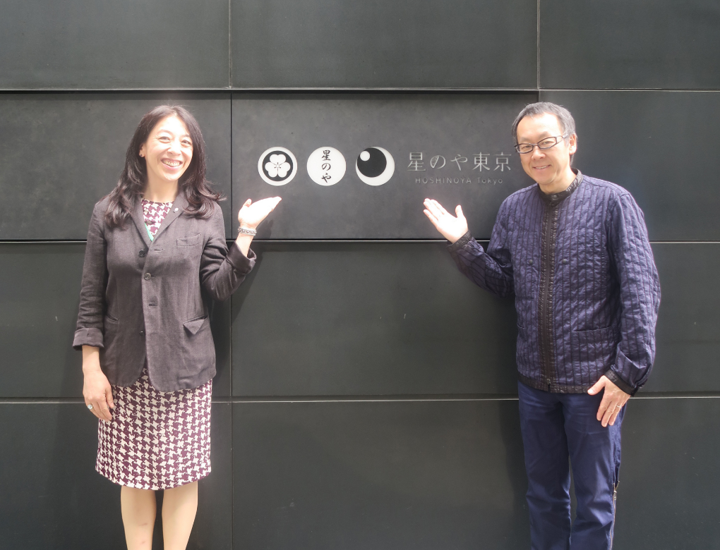 星のや東京の玄関にて、星野リゾート代表の星野佳路と記念撮影持続可能な観光不動産金融のエコシステムを目指す